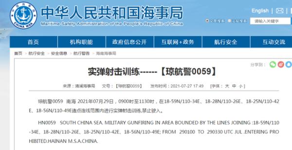 南海部分海域、黄海北部两处区域将分别进行实弹射击,禁止驶入!