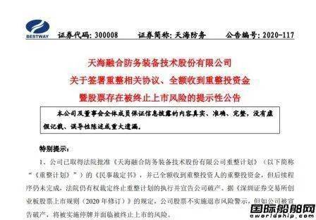 法院已裁定批准《重整计划》并终止天海防务重整程序。以上内容详见《关于法院裁定批准重整计划的公告》(公告编号:2020-102)。