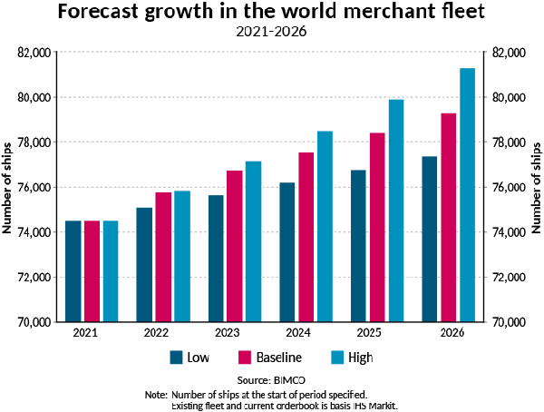 BIMCO预计,从2021年初到2026年初,全球船队在基准情景下的年复合增长率(CAGR)为1.25%,而过去5年的复合增长率为1.44%。