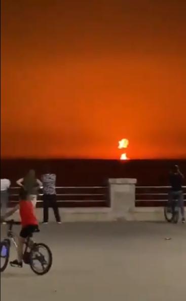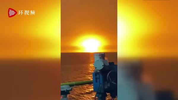 根据卫星社分享的视频画面,当时海上发生大爆炸,火焰和浓烟从水面上升起,火光直冲上天。