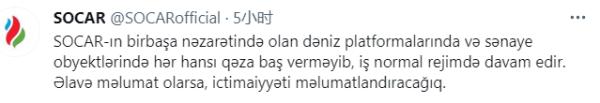 “阿塞拜疆国家石油公司直接控制下的海上平台和工业设施没有发生事故,工作照常进行。如果有更多信息,我们将告知公众。”阿塞拜疆国家石油公司当地时间4日深夜在推特上表示。