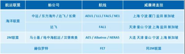 目前,海洋联盟、2M联盟和赫伯罗特,共8家船公司提供亚洲主要港口直挂威廉港的航线。