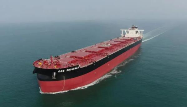 ORE ZHOUSHAN轮是招商轮船32.5万吨超大型矿砂船项目6艘系列船建造的最后1艘,由上海船舶设计研究院设计,青岛北海船舶重工有限责任公司建造,于今年3月16日交付,主要用于巴西-中国航线的矿石运输。该船总长339.9m,型宽62m,型深29.5m,可以用重油、柴油、MGO作为燃料,配置压载水处理装置、脱硫装置、高压岸电装置,可实现靠岸零排放,具有绿色、安全、高效、节能等特点。