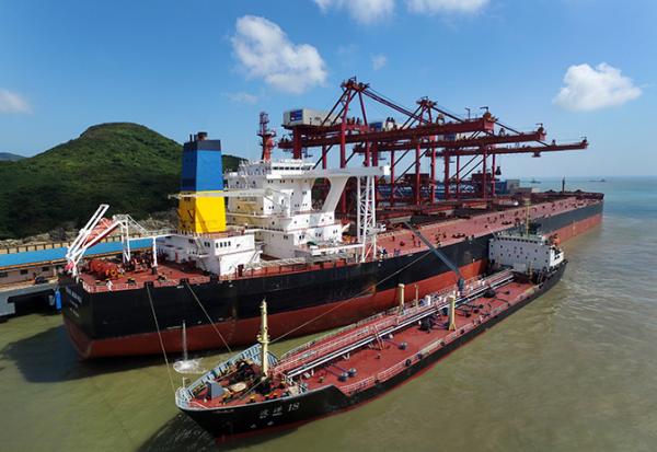 7月11日,招商轮船旗下32.5万吨超大型矿砂船ORE ZHOUSHAN轮满载铁矿石缓缓靠泊宁波舟山港马迹山矿石码头1号泊位,圆满完成从巴西到舟山的首航,舟山港以“过水门”最高礼遇迎接这艘巨轮的到来。