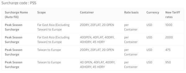 对从远东(不包括中国台湾)至欧洲的40英尺干箱、框架集装箱、敞顶箱、高箱,以及45英尺的高箱,每箱收取2000美元。