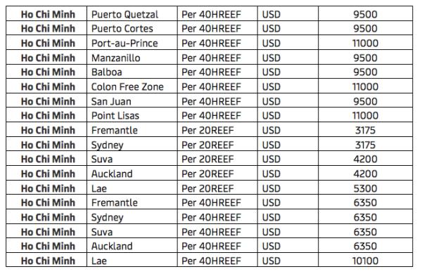 胡志明至全球冷箱新运费标准
