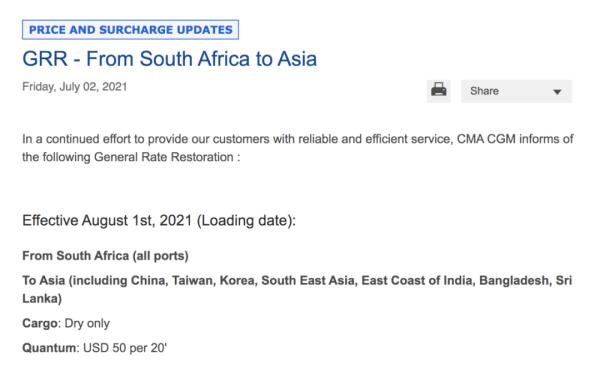 此外,达飞还上调了从南非至亚洲的费率恢复费(GRR)。