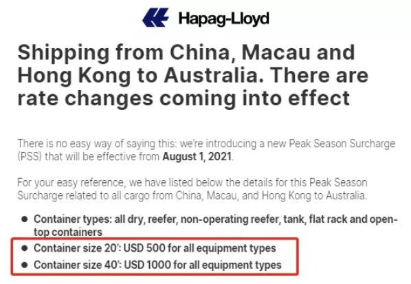 赫伯罗特日前发布公告,推出从中国、中国澳门和中国香港到澳大利亚的所有货物相关新的旺季附加费 (PSS),该附加费将从2021年8月1日起生效。