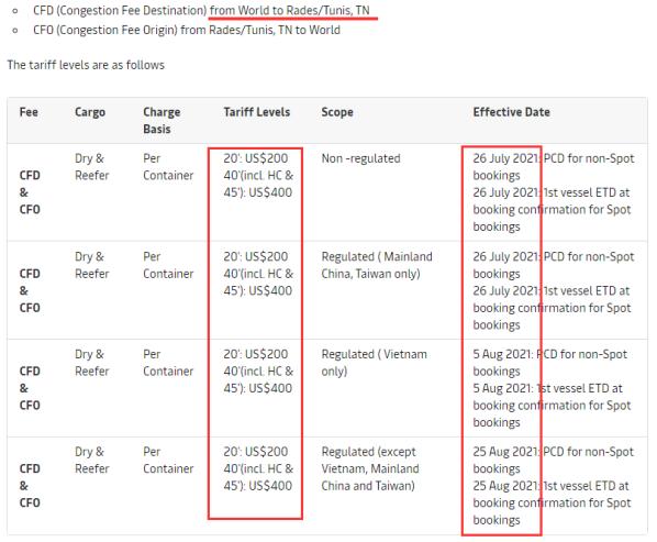 马士基通知称:突尼斯码头和集装箱堆场的严重拥堵继续对供应链造成严重限制。面临总体运营成本的显着增加。为了能够继续保障供应链,我们将征收拥堵费。具体收费情况如下: