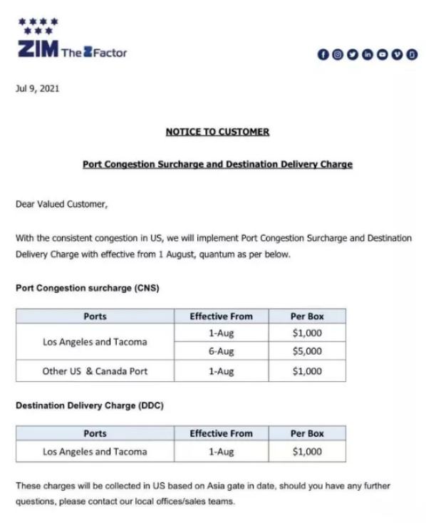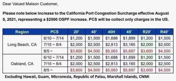 美森轮船上周宣布,从8月5日开始对美西港口再次增加港口拥堵费2000美元每柜。而这已经是6月10日开始推涨的第三步港口拥堵费,三次港口拥堵费叠加之后,其中45尺柜更是高达5697美元!