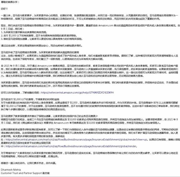 亚马逊重新启动新一轮的投保保险要求,如果有客户收到上述邮件的,需要及时提供保单给到平台,否则将会停止销售。
