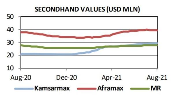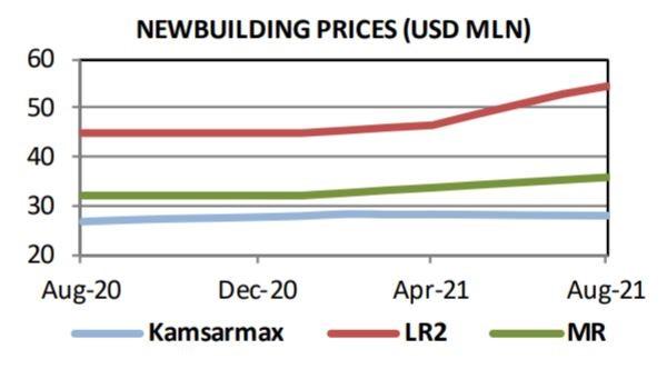 与此同时,在新造船市场,Allied表示,“在夏季假期期间,购买兴趣又回到了干散货新造船市场,因为该领域出现了一系列新订单。”大多数的兴趣集中在Kamsarmax类型,订单中再添6艘新船。运费收益持续上升的势头以及该领域整体的供需前景良好,再次增加了人们对新造船项目的兴趣。但是,新造船建筑价格的上升是投资的潜在障碍,预计这将继续成为一个不利因素。