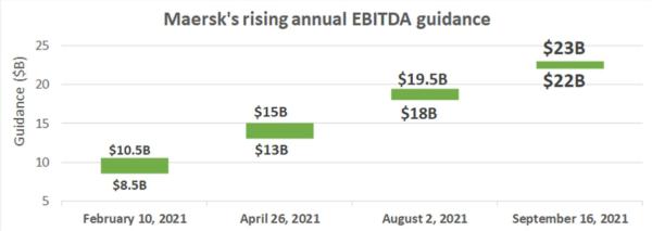 2021年第一季度,在录得40亿美元的实际息税折旧及摊销前利润后,马士基将2021年的业绩预期提升至130亿-150亿美元。到了8月初,马士基预计第三季度显然会好于第二季度,因此再次调高业绩预期,至180亿-195亿美元。