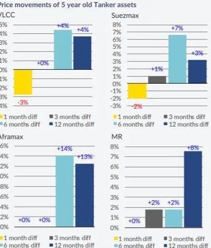 而油轮交易活跃度则未见起色,反映出市场参与者仍然缺乏信心。市场供过于求使买家再次远离二手船交易市场,而卖家数量预计将继续增加。油轮资产价格在过去一周有所下降,但仍保持在相对较高的水平。