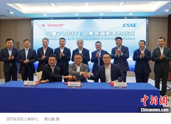 中新网上海10月17日电 (记者 殷立勤通讯员严鹏)10月17日,中国船舶集团有限公司旗下上海外高桥造船有限公司联合中国船舶工业贸易有限公司与加拿大Seaspan公司在上海正式签订10艘7000TEU集装箱船建造合同。中国船舶集团董事长雷凡培、副总经理孙伟,ATLAS集团首席执行官、SEASPAN公司董事长陈兵,SEASPAN公司高级副总裁李堃等出席签约仪式。本次签约是继今年3月Seaspan公司与中国船舶集团旗下沪东中华造船(集团)有限公司和江南造船(集团)有限责任公司订造6艘15500TEU集装箱船之后,中国船舶集团与ATLAS集团的再度携手,必将谱写出友好合作的新篇章。