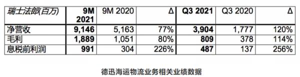 具体到海运物流业务,2021年前三季度,德迅实现净营收91.46亿瑞士法郎(约合99.53亿美元),同比增长77%;EBIT为9.91亿瑞士法郎(约合10.78亿美元),同比增长226%。实现集装箱操作量340万标箱,略高于上年同期。
