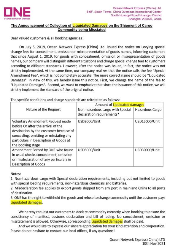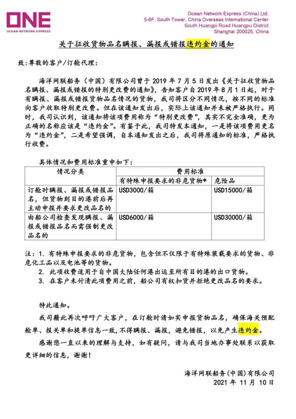 海洋网联船务(中国)有限公司曾于2019年7月5日发出《关于征收货物品名瞒报、漏报或错报的特别更改费的通知》,告知客户自2019年8月1日起,对于有瞒报、漏报或错报货物品名情况的货物,我司将区分不同情况,按不同的标准向客户收取特别更改费。但在该通知发出后,实际上该通知并未被严格执行。同时,我司认识到,该通知将该项费用称为“特别更改费”,其实不完全准确,更为正确的名称应该是“违约金”。有鉴于此,我司特发本通知,一是将该项费用更名为“违约金”,二是希望强调,自本通知发出之后,我司将原通知的标准,严格执行收费。