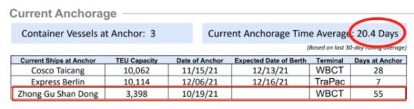 根据南加州海洋交易所(Marine Exchange of Southern California)的最新数据,在绵延1000英里的北美海岸线上,有101艘集装箱船停泊或游荡在美国的两个门户航道上等待泊位。在疫情之前,从亚洲到北美通常只需要两周的航程的船只现在由于拥堵延误却占用了巨大的运力,有些航程船舶的靠泊时间超过了45天。“中谷山东”号等待泊位已达55天。