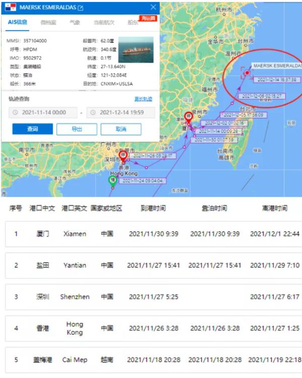 这艘11月底曾挂靠香港、深圳、盐田、厦门港的13000标准箱的“Maersk Esmeraldas”号于两天前离开厦门港(实际上12月1日已离港),目前仍停泊在离中国海岸线不远的海域,计划于1月11日抵达洛杉矶,需要一个月的中转时间,这表明了跨太平洋航线上的拥堵规模。