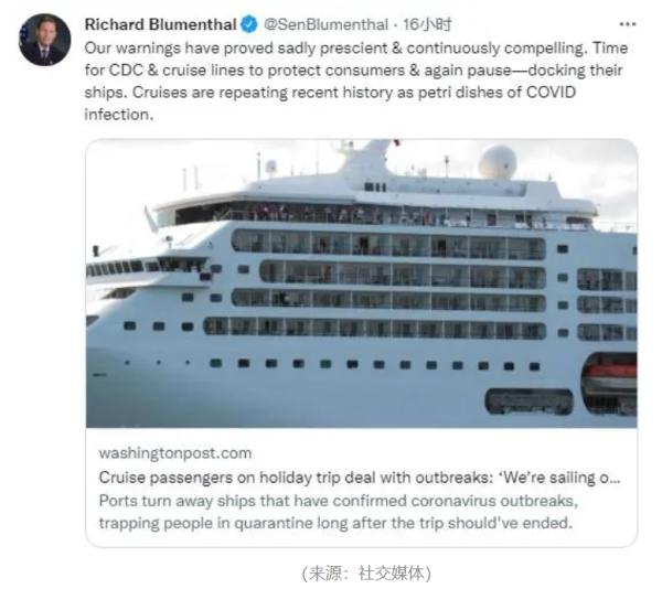 即便上市公司们努力安抚情绪,质疑的声音仍在持续扩大。民主党参议员Richard Blumenthal周二在社交媒体上表示,很遗憾早些时候的警告被不断确证,现在是CDC和邮轮公司再次停运以保护消费者的时候了,眼下邮轮公司正在重复自己作为新冠病毒培养皿的历史。