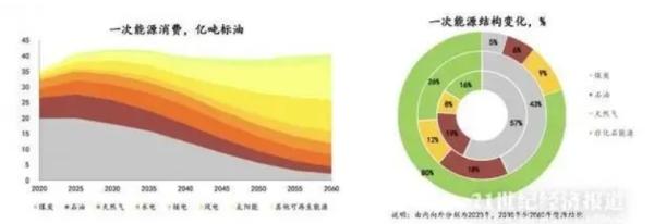 《能源展望》指出,到2030年,非化石能源在中国一次能源中的比重将增至26%左右,2060年增至80%;煤炭占比持续下降,到2030年降至43%,2060年降至5%;2030年前,中国石油占比稳定在18%,到2060年降至6%;2030年天然气占比增至12%,到2060年降至9%。