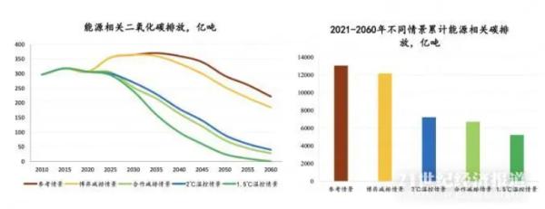 在《能源展望》的参考情景下,各国的现有政策措施难以实现《巴黎协定》气候目标,到2060年能源相关的碳排放仍将达到222亿吨。若各国出台更加积极的转型政策措施,技术进步、能效提升和加快推广,2060能源相关的二氧化碳排放将降至31亿吨,全球温升控制在2摄氏度以内。