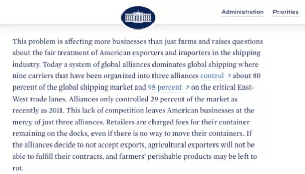 在最近白宫的一篇博文中,拜登政府抨击了集装箱公司之间缺乏竞争的问题。该文章指出,三个班轮集团——2M联盟、海洋联盟和THE联盟控制着全球班轮运输市场运力的80%,在东西贸易航线上控制着95%的运力,而在2011年,所有联盟只控制着29%的市场。