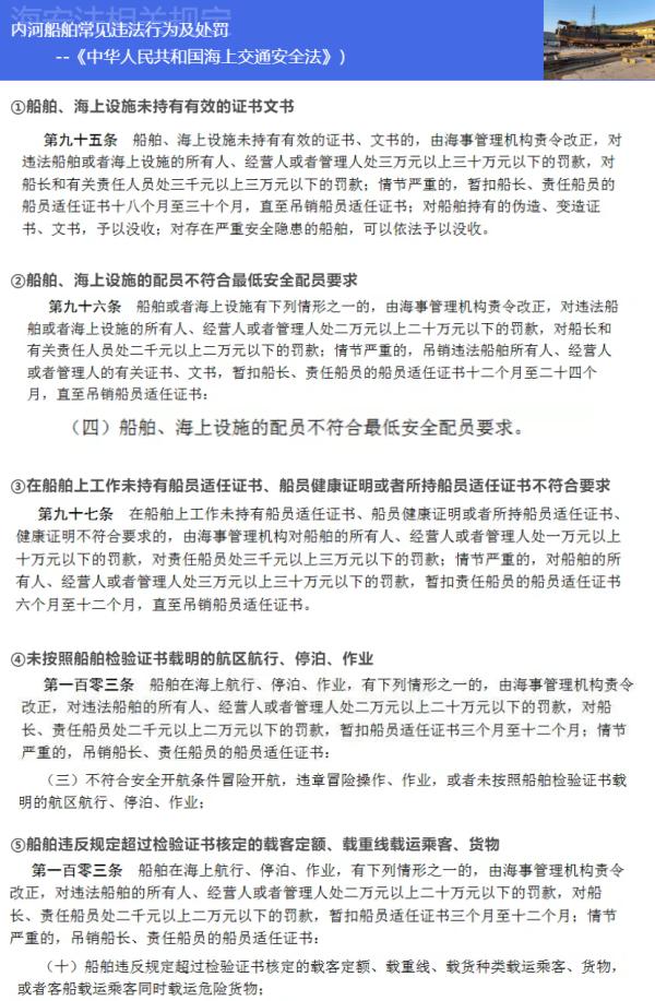 1、内河船结构、装备、建造与海船的标准完全不同,船体抗腐蚀效果不佳,干舷普遍较低,稳性及抗风能力较差,普遍缺少救生及应急通讯设备,难以适应海上的复杂通航环境及潮汐气候变化,对其他正常航行的海船也造成干扰隐患,一旦发生事故极易造成船毁人亡的严重后果。