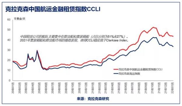 中国租赁公司的船队主要集中在散货船和集装箱船,截止2022年初,这两种船型占中国租赁公司总船队运力比重分别为39%和20%,占CCLI所涉船队运力的比重分别为48%和25%(2021年CCLI运力比重分别为51%和27%,由于CCLI新增LNG船等使得集散运力占比略有下调)。2021年集装箱船和散货船日收益的强劲攀升也使得CCLI整体优于克拉克森海运指数的表现,近期CCLI较克拉克森海运指数的溢价已接近10,000美金/天。