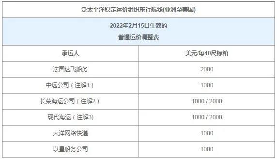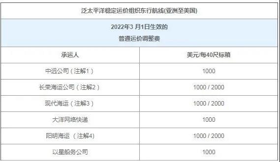 一些泛太平洋稳定运价协议组织成员更新了运价本,包括从2022年3月1日生效的普通运价调整费。这包括中远公司、长荣海运公司、现代商船公司、大洋网络快递、阳明海运及以星海运。下述表格是40尺箱标箱的收期标准,其它箱型收费标准按一般折算公式计算,3月1日生效的普通运价调整费是2022年以来东亚/美国航线第5次的普通运价调整费。