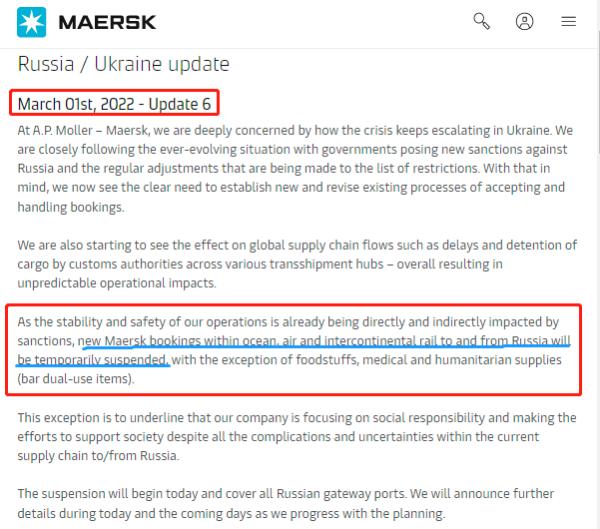 目前马士基已注意到事件对全球供应链的影响,例如货物在各中转枢纽的延误和扣留——总体上造成不可预测的运营影响。由于其业务的稳定性和安全性已经受到制裁的直接和间接影响,除食品、医疗和人道主义用品外,马士基将暂停海运、空运和洲际铁路往返俄罗斯的新预订。即日起(3月1日)执行,覆盖所有俄罗斯门户港口。随着计划的推进,马士基将在未来几天公布更多细节。