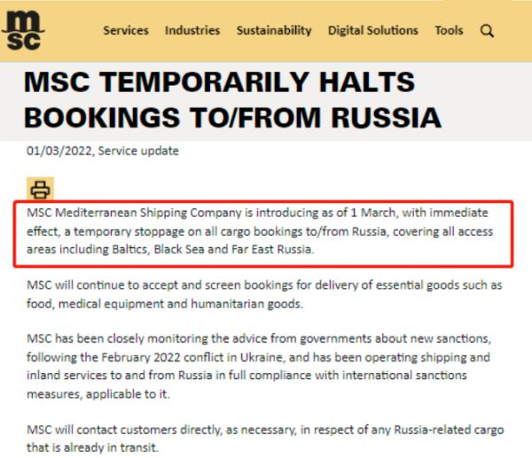 3月1日, MSC地中海航运发布公告称,3月1日起立即暂停所有往返俄罗斯货物DE 预订,包括波罗的海、黑海和俄罗斯远东地区。不过MSC将继续接受并筛选运送食品、医疗设备和人道主义物品等必需品的预订。