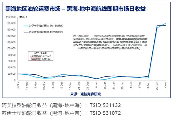 一些船东不愿意挂靠俄罗斯港口及承接相关货物,这已对航运市场产生了一定影响。部分地区的油轮运费价格暴涨,黑海-地中海的阿芙拉型油轮和苏伊士型油轮即期市场日收益从2月18日的约10,000美金/天跳涨至2月25日的超过170,000美金/天,且相关运费上涨了约400%。本周的趋势显示黑海和波罗的海的油轮运费继续保持坚挺,邻近市场表现强劲且溢出效应也带动了其他部分市场,但并非所有油轮市场都如此。部分散货船市场也受到扰动和上涨,部分由于物流中断、重新寻租、潜在的建立库存以及寻找替代来源等因素造成。