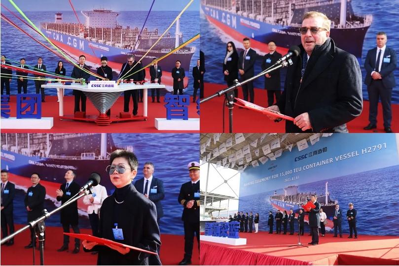 自2013 年江南造船开启与达飞的合作,今天举行命名的船舶是公司为达飞海运集团建造的第18艘船舶。这艘船的交付既是达飞与江南深厚友谊与卓越合作的又一结晶,更是中法两国在高端制造领域合作共赢的又一典范。衷心感谢达飞海运集团、中信保和中国进出口银行的大力支持,祝愿这艘集装箱船在未来乘风破浪、航程万里,也期待江南与达飞继续深化合作,在更多领域开拓创新,携手并进共同书写航运发展的崭新华章。