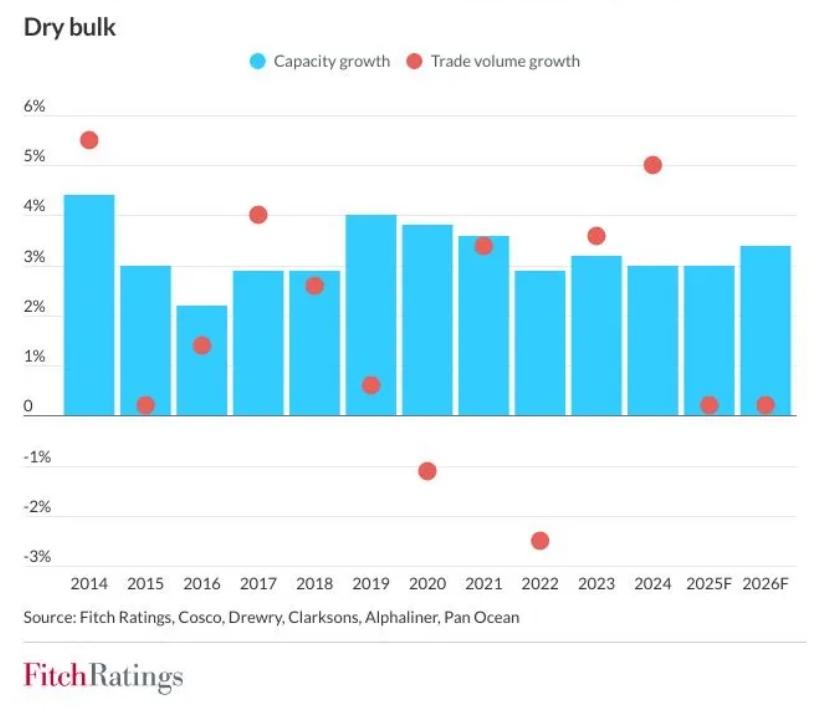 干散货市场方面,惠誉评级预计行业整体表现偏弱,但运输量将基本保持同比稳定。目前,干散货船和油轮的手持订单量分别约占现有船队的11%和16%,主要用于更新老龄船舶。由于未来三年船厂产能紧张,新一轮大规模运力扩张的空间相对有限。