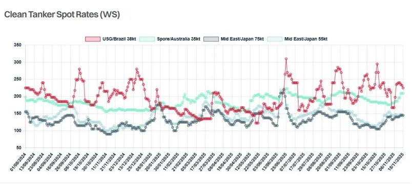 在原油船型方面,若制裁解除且俄油折扣收窄,中印买家将面临更多竞争,这将推动 VLCC(超大型油轮)受益。随着中印转向西非、美洲等远距离非俄货源,VLCC 的需求将获得支撑。相比之下,Aframax 和 Suezmax 这两类在冲突初期受益最大的船型,若局势正常化,将面临短途航线回归带来的最严峻的需求回落风险。此外,LR2 型船因“东油西运”减少前景黯淡,而 MR 型船则因抗跌性较强,有望在俄欧航线或美洲区域市场获得重新部署的机会。
