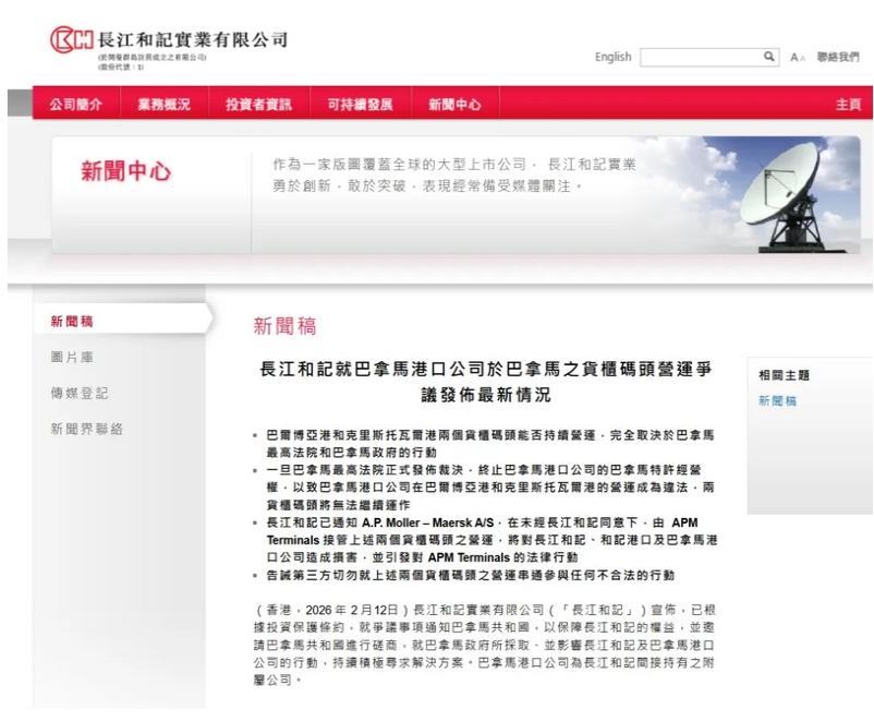 和记港口集团有限公司(下称“和记港口”)已于2026年2月10日通知A.P. Moller – Maersk A/S,在未经长江和记同意下,任何由APMT或其任何联属公司,在任何时期、以任何方式接管巴拿马港口公司于巴尔博亚港或克里斯托瓦尔港之管理或营运,将对长江和记、和记港口及巴拿马港口公司造成损害,并引发对APMT及/或有份参与的联属公司之法律行动。