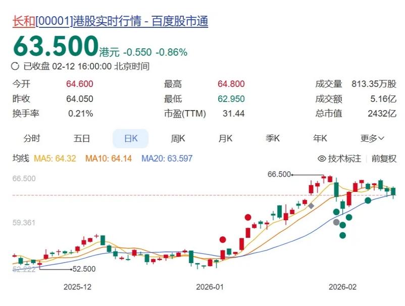 截至2月12日收盘,长和股价跌0.86%,已是连续第3个交易日下跌,总市值2432亿港元。