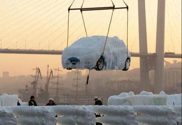 一货船遭遇极端天气 运载车辆变“冰坨”