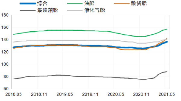 5月,克拉克森新船价格指数收于136.1点,环比回涨2.4点,同比上涨8.8点。从主力船型看,散货船、油船、集装箱船和液化气船的克拉克森新船价格指数分别为141.5点、156.8点、87.6点和140.3点,环比分别上涨5.2点、1.9点、1.1点和1.2点;同比分别提升15.4点、6.2点、9.7点和2.4点。从典型船型看,主力船型新船价格均出现不同程度涨幅,其中大箱船、好望角型散货船和VLCC涨幅达200万美元左右。