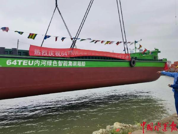 6月26日,国内首艘64TEU内河绿色智能集装箱船“国创号”正式下水。