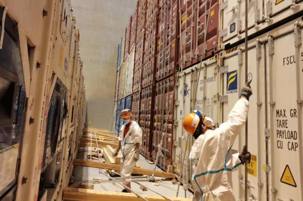 由于该轮船体积载结构与标准集装箱船存在较大差异,且舱内缺少集装箱配套固定设施,需要码头方提供细致的集装箱绑扎服务。接到任务后,梅东公司为保证舱内绑扎作业满足客户要求,秉持优质服务理念,坚持以“质量”为核心,积极克服疫情防控及夏日高温带来的影响,专班人员上船作业,确保整体装船作业顺利流畅。