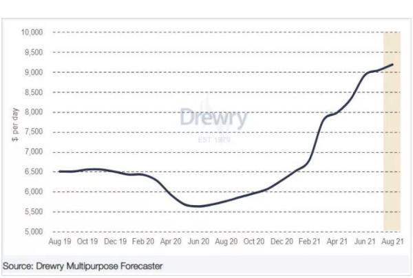 德鲁里多用途定期租船指数在7 月份增至每天9,056 美元,仅上涨1.4%,而上个月的涨幅为7.1%。德鲁里指数自年初以来上涨了39%,自 2020年 7 月以来上涨了59%。德鲁里预计该指数在8 月份将进一步上涨1.6%,达到每天9,200 美元。