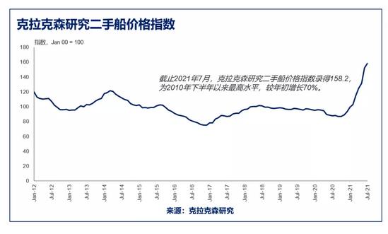 克拉克森研究二手船价格综合指数随着海运运费收益上升而强势上涨,较年初增长70%。其中5年船龄二手船价格指数较年初增长43%,为2014年3月以来录得的最高指数水平。