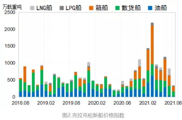 集装箱船方面,1-8月全球签约新船订单388艘、3614万载重吨,同比增长1292.7%,具体订单包括176艘万箱船、99艘中型箱船和113艘支线箱船。油船方面,1-8月全球签约万吨以上油船新船订单159艘、1885万载重吨,同比增长48.6%,具体订单包括33艘VLCC、11艘苏伊士型、29艘阿芙拉型和86艘中小型成品油船。散货船方面,1-8月全球签约新船订单229艘、2168万载重吨,同比增长59.2%,具体订单包括50艘好望角型、86艘巴拿马型、49艘大灵便型和41艘小灵便型。液化气船方面,1-8月全球签约新船134艘、778万载重吨,同比增加22.0%,具体包括38艘大型LNG船、54艘VLGC以及42艘中小型液化气船。