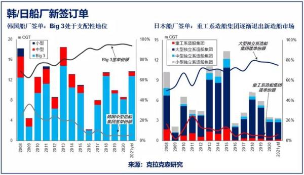 韩国造船业高度集中,Big 3的接单占比高达93-95%。为了增强韩国造船业的国际竞争力,韩国政府方面引入私有资本以重新提振韩国中型造船集团。自2020年末起,韩国方面已成功私有化3家造船集团,此外,预计还有部分造船产能(尽管产能不大)将重启。