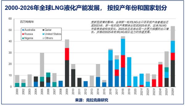 近些年LNG船队运力持续快速扩张,2014年初至今船队规模平均每年增长8%,主要受到大型天然气出口项目陆续投产的支撑。2016-19年期间平均每年新增投产产能3,300万吨/年,主要分布在美国和澳大利亚,推动了2015-2020年间全球LNG贸易量增长44%。