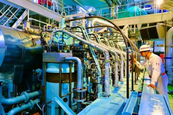 另一方面,根据船舶应用低碳零碳燃料的趋势,“宏利”号还实现了中国船舶集团旗下中船动力(集团)有限公司自主研发的世界最小缸径天然气低压双燃料低速机——CX40DF发动机的首次实船应用。该型发动机额定功率达5844千瓦,而缸径只有400毫米,是目前全世界性能指标最高的双燃料船用发动机,其电控系统、增压器以及油雾探测器等关重件均为自主研制,国产化率超80%。相较常规柴油机,该型发动机在LNG模式下可降低99%的硫氧化物、90%的氮氧化物、99%的颗粒物以及18%的温室气体排放。