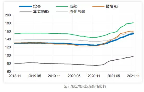 11月份,克拉克森新船价格指数收于153.6点,环比回涨1.3点,同比上涨28.5点。从主力船型看,散货船、油船、集装箱船和液化气船的克拉克森新船价格指数分别为160.1点、180.9点、98.0点和157.1点,环比分别上涨0点、1.5点、2.0点和1.4点;同比分别提升36.8点、36.1点、22.6点和23.2点。从典型船型看,典型船型的新船价格稳中有升, VLCC、17.4万立方米LNG船的价格已分别达到1.09亿美元和2.05亿美元的高位水平。
