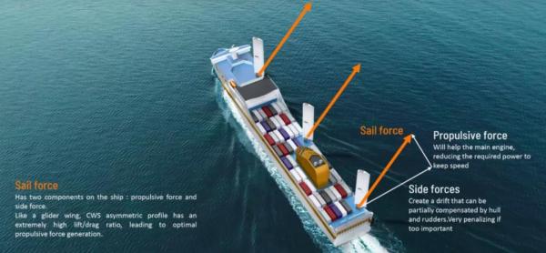 除此之外,Zéphyr & Borée公司正在开发一些风力辅助设计,包括Canopée号,它被称为世界上第一艘风力辅助航行的货船。这艘船是为欧洲太空计划中的阿丽亚娜6号发射装置的运输需求而设计的,船长121米,配备了四个铰接式翼帆,每个翼帆的面积约为362平方米。预计该船将于2022年投入使用,当该船以16节的速度运行时,风帆将减少25%的燃料消耗。